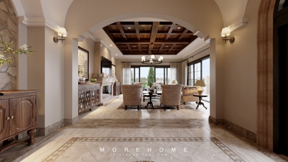 Thảm trải sàn thổ cầm, đồ nội thất gỗ óc chó kết hợp đá ốp tường, sự vận dụng cách tân nhưng khá độc đáo trong thiết kế nội thất tân cổ điển đã tạo nên vẻ đẹp sang trọng cho không gian điển hình phòng khách nhà phố, biệt thự.