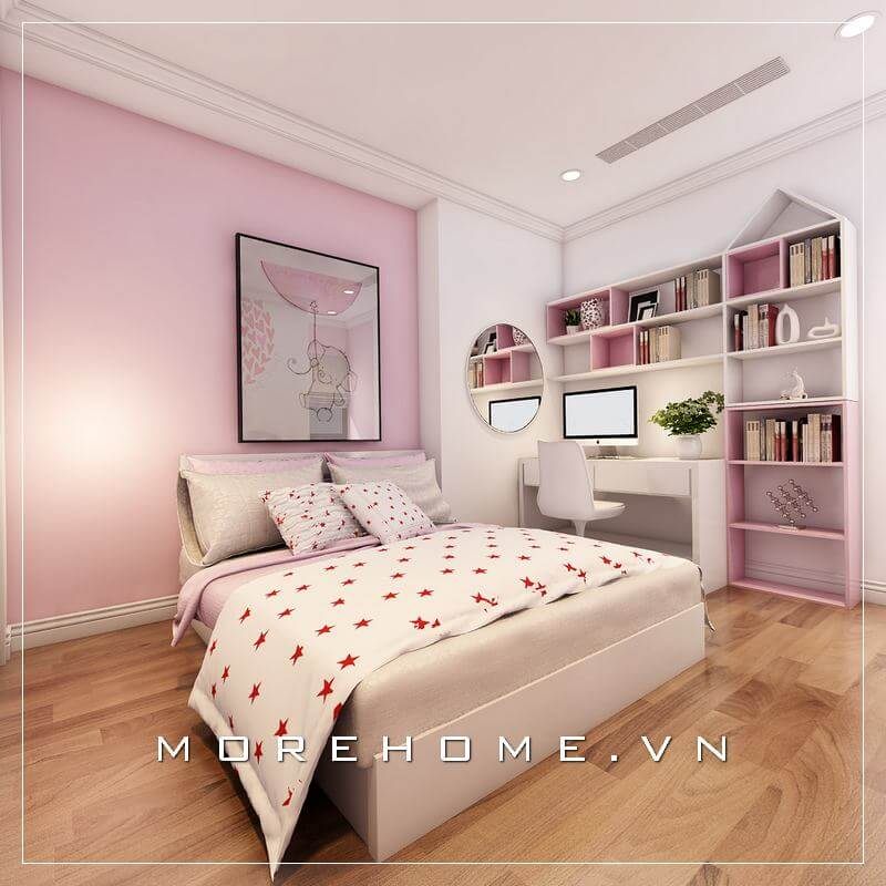 Gia chủ đã lựa chọn bố trí nội thất phòng ngủ khoa học và tiện nghi, với gam màu trắng - hồng để tạo ra sự mới mẻ và tinh tế, phù hợp với phòng ngủ của bé gái.